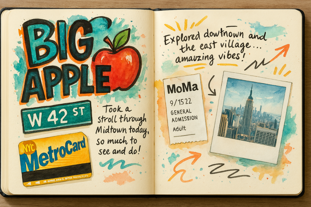Tu es allée à New York et tu veux faire une page stylée sans forcément beaucoup dessiner ? Voici une mise en page simple, sympa et visuelle :
