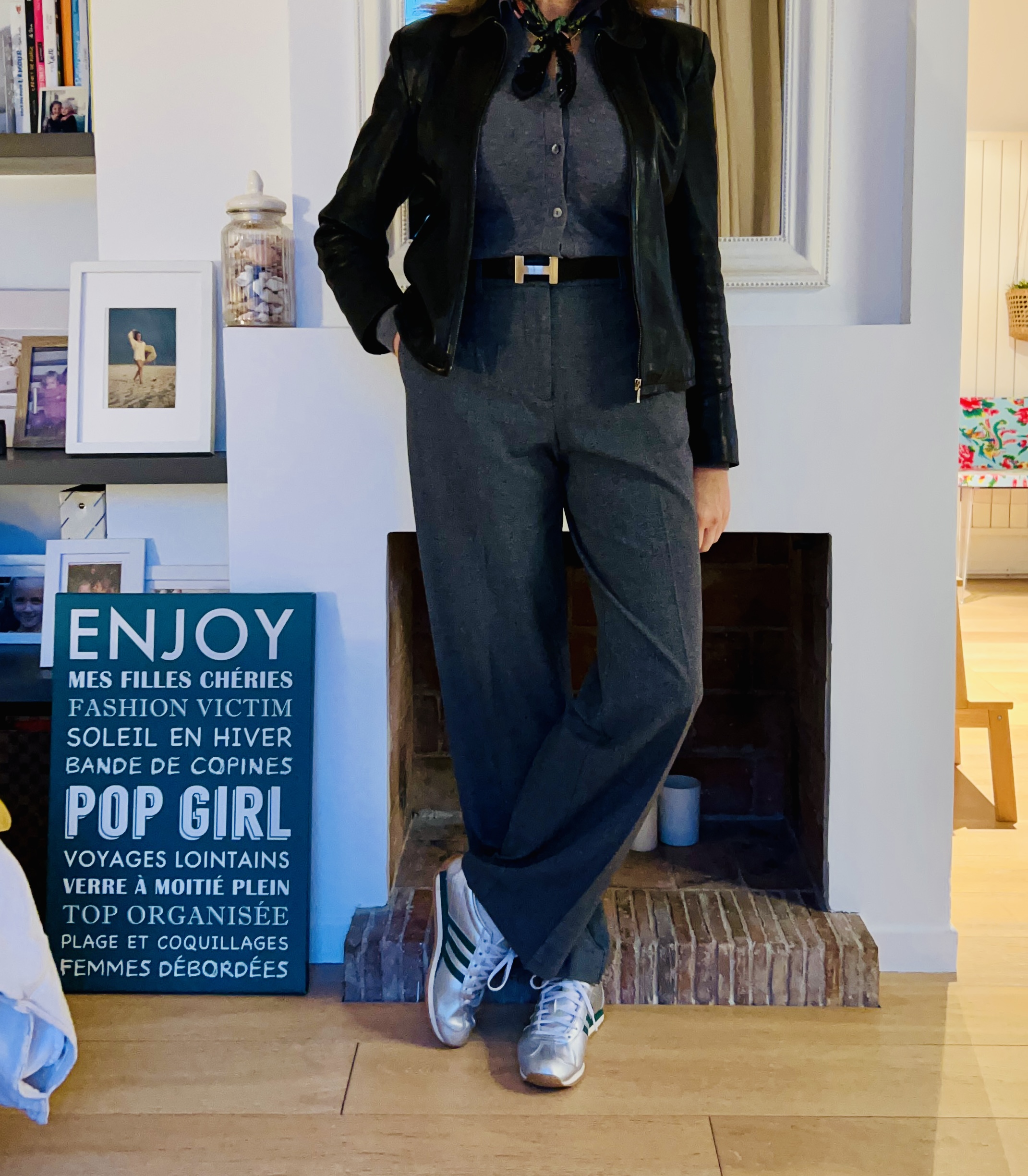 Un petit look black & white pour démarrer la semaine avec un tailleur pantalon noir et une chemise blanche, c’est un look 0 risque et 0 faute ! Allez pour pimper tout ça, j’ai sorti mes baskets léopard et hop, ça change tout ! Ha oui et aussi veste oversize , très important la veste …